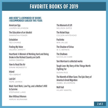 Hij schrijft erbij: ”As we wind down 2019, I wanted to share with you my annual list of favorites that made the last year a little brighter. We’ll start with books today — movies and music coming soon. I hope you enjoy these as much as I did.”