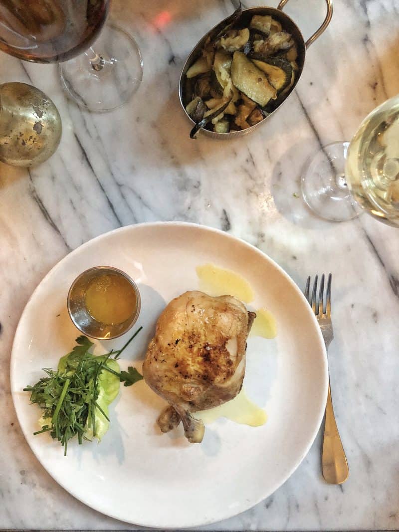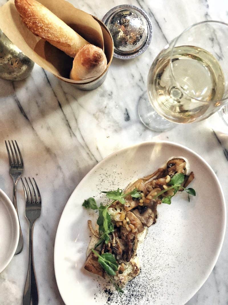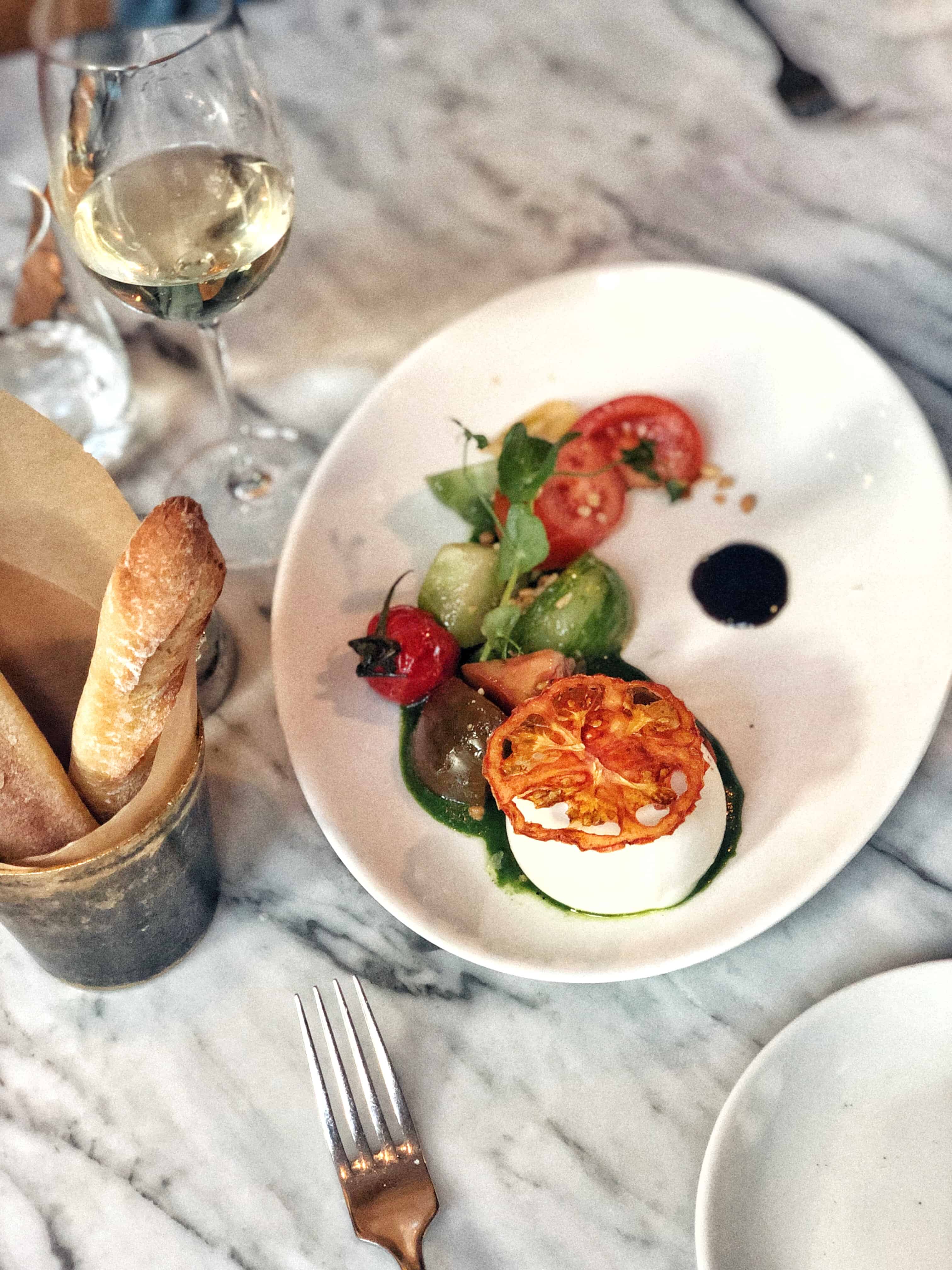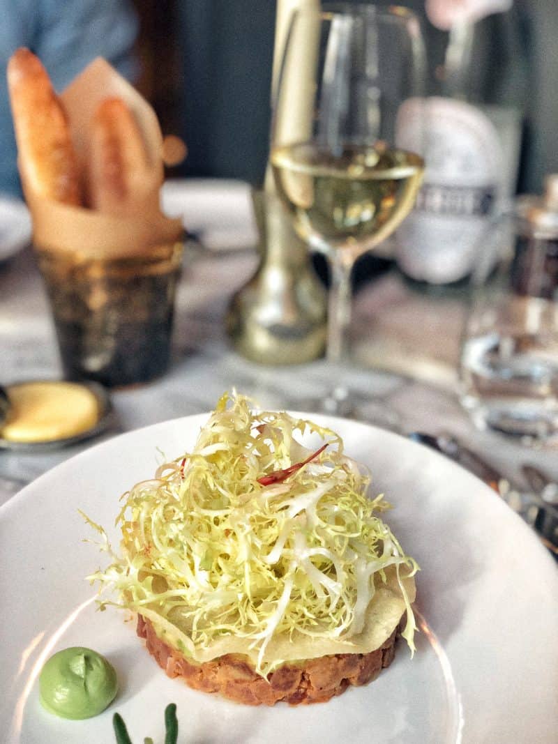 In het hotel-restaurant vind je comfortabele mosgroene banken langs de muren, witte marmeren tafeltjes met daarom roze servetten (zijn we gek op) en een open keuken. Daar worden flink wat blikken in geworpen door foodies als wij. En voor wie nog beter zicht wilt krijgen op wat er in de keuken gebeurt: neem plaats aan de marmeren keukenbar.